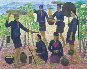 熟悉高更的人一眼可以看出,王雄的大型油画作品《黎女之歌》、《长歌·黎人》、《秋天节拍》等等,无不是深受了高更的代表作《我们从哪里来?我们是谁?我们到哪里去?》的影响。从立意到构图到用色到笔法,王雄将高更的塔希提风情替换为海南岛上原汁原味的黎家场景。画中的人物,有的在低头酿酒,有的在舂米、簸米,有的席地而坐织黎锦,有的在采摘槟榔,还有的三五成群提陶罐舀水……也就是说王雄通过一幅作品,将从前岁月里黎家生活中的无数个场景有效融合在了一起,让画面呈现出一种史诗般的效果。强烈的轮廓线以及用主观化色彩表现经过概括、简化了的形体,都服从于几何形图案,从而取得音乐性、节奏感和装饰效果。它不存在太深奥的含义,也无需观赏者去费神推敲。然而,这类作品或许不缺乏市场。越是在被现代性严重绑架的所在,越可能有更多的人希望抛弃现代文明以及古典文化的阻碍,回到初民那种简单、淳朴的原始生活方式中去。而富有装饰性效果的、表现民族风的美术作品往往可以帮助人们到达那个所谓的理想国。