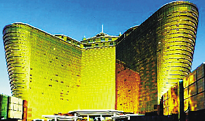 北京金泉时代 位于北京亚奥核心商圈的金泉时代建筑,面积16万平方米,建筑总高122.8米,外立面采用全金色玻璃幕墙,建筑结构为纯钢框架结构,用钢量为3.7万吨,相当于鸟巢用钢量的三分之二。