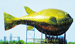 江苏中华河豚塔 江苏扬中园博园,一条宽44米,高62米,长90米的巨型“河豚”,是对着河豚标本,按比例放大设计建造的。为扬中市新地标建筑。由同济大学建筑设计院设计,重约2100吨,外表由8920块不同形状的黄铜金属表皮单元空间定位拼接而成。