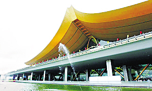 昆明长水国际机场 昆明长水国际机场,空中俯瞰,新机场主建筑造型既酷似飞机,又仿若一只展翅的金色凤凰,在阳光下金光闪闪。据昆明机场方面介绍,七彩带与“金镶玉”铸就金色壮美,位于中心区象征着七彩云南的七条钢结构巨型彩带,总吨位约3万吨,既作为承重又作为装饰。