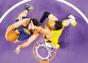 11月23日,在NBA常规赛中,湖人队主场以102:95战胜勇士队。图为湖人队球员加索尔(右)防守勇士队球员大卫·李。 新华社发