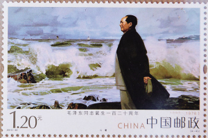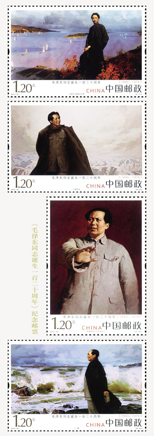 《毛泽东同志诞生一百二十周年》纪念邮票一套四枚,画面以四幅大型领袖的油画体现,作品名称分别是《问苍茫大地谁主沉浮》《北国风光》《毛泽东在十二月会议上》和《心潮》。《问苍茫大地谁主沉浮》表现了青年毛泽东在橘子洲头欲投身革命洪流的风貌,《北国风光》表现了红军长征胜利后毛泽东欲领导全党全国人民推翻旧世界的革命豪情,《毛泽东在十二月会议上》表现了毛泽东希望全党同志在胜利后务必继续努力奋斗的生动讲话形象,《心潮》则表现了毛泽东在滔滔大海(暗喻世界风云)前的自信与胆识。宏伟庄重的画面,给人强烈的直观感染力,因此这套邮票一面世,立即得到收藏爱好者的普遍赞赏。
