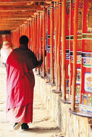 跟在一些转经的藏民身后游览寺庙,几乎是接近郎木寺的最好方式。在依山而开的坡道上,他们不仅认路,也不会走的太快。汉语好的藏民还会善意地告诉你每座大殿的名字。从小山坡不远处的小经房开始,然后去旁边的转经筒,然后是各个重要的大殿,从各主殿后方绕一圈,几乎把郎木寺所在的半个山都走了一遍。下山时还要经过几排转经筒,转经的老人们停下来,坐在那里边晒太阳边休息。一些不知从哪里跑来的孩子在空地上嬉笑打闹,成为冬日寂静寺庙另一种音调。