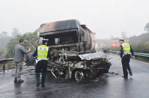 据了解,事故发生时,一辆小轿车发生侧翻事故,交警正在处理事故现场时,一辆运煤灰的罐式重型半挂货车失控追尾前方排行等待的18辆轿车,造成连环相撞,货车当场起火。