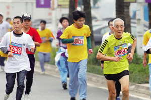12月21日,来自北京79岁的马孟援,是比赛中年龄最大的选手,他与当地学生一起进行了5公里迷你马拉松跑,仅用27分钟跑完全程。舒晓 摄
