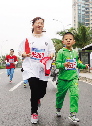12月21日,来自儋州的一对母子在参加国际马拉松赛5公里迷你马拉松跑。舒晓 摄