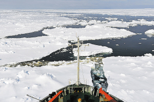 自从19日驶离中山站附近的陆缘冰地带,“雪龙”号就一直与普里兹湾厚重的浮冰斗争。连日来,“雪龙”只能以三、四节的航速艰难前行,船体压着大块浮冰,不时发出沉闷而喑哑的破冰声。