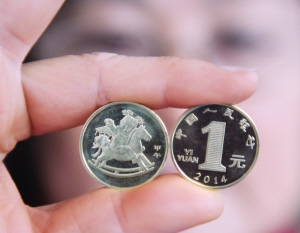 12月23日,琼海一名工作人员展示即将发行的马年纪念币。央行将于12月24日发行马年纪念币。该纪念币正面印有“中国人民银行”及“1元”字样,背面图案是一个小孩在骑木马。据介绍,马年纪念币将发行1亿枚,与普通1元币在市面上流通,市民可到各银行网点兑换。