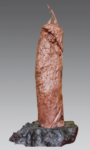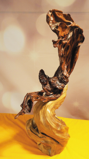 “因为原料太珍贵了,在创作时不可能大块剔除,只能根据原料形状构思创作。”范力铭说。《敦煌飞天》以敦煌莫高窟中飞天壁画为题材,高高扬起的裙摆轻盈灵动,浑然天成,是黄花梨雕刻中难得的艺术精品。范力铭说,创作这件作品时,自己动刀的地方并不多,大部分时间都花在构思上。完成创作后,他曾经有意识地寻找类似的材料,想做一组“飞天”作品,但是一直没有寻找到合适的原料。“一件好的作品诞生,真的需要天时、地利、人和各种因素俱备。”范力铭感慨地告诉记者。