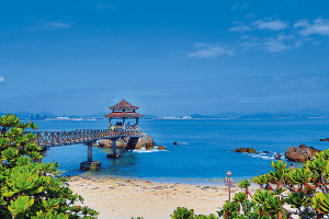 正沉醉中,车子转入到了一片平缓坡地,只见树木高大,繁花盛放,几排房子错落有致地掩映在树林中。小邵说,这里是宾馆区,可以停车,大家下来逛逛吧。我们走到白色沙滩边上一个叫海盗吧的地方,坐下来歇歇脚。阳光、白云、海浪、沙滩、醉人的椰林以及阵阵涛声和徐徐海风扑面而来,喝一杯甘甜清冽的椰子水,品一口原汁原味的海鲜烧烤,看看眼前的风景,一种面朝大海春暖花开的惬意感油然而生。小邵指了指左前方告诉我们,那座夏季码头旁的情人桥,原是座铁索桥,是当年守岛部队的海上瞭望点,在摇摇晃晃的铁索桥上,需要几分胆量和机灵,有些年轻女子既想过桥到瞭望点体会一下,又怕掉进海水里,过桥时紧紧抓住朋友的手不放,因此这桥又被戏称为“情人桥”。后来“岛主”为客人安全着想,改造成现在的木板桥。离海滩不算远的林带边缘有好多竹子和芭蕉叶搭建的情侣小屋,满溢浪漫迷情。每当日出日落,晨钟暮鼓,这里便成了青年男女耳语、听涛的好地方,也是年轻情侶拍摄婚纱照的绝佳胜地,平均每年吸引将近一千对全国各地的青年情侣到这里旅游,因而它有一个浪漫的名字:“情人岛”。在客人们赞叹不已的道谢声中,我们恋恋不舍地结束了这一美丽的邂逅。