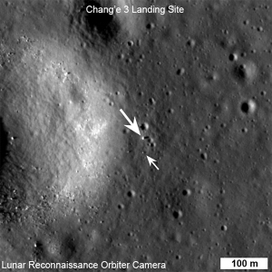 嫦娥三号12月14日成功降落月球。美国航天局说,当时“月球勘测轨道飞行器”距离较远,因而没有观测到降落过程,直到12月24日,这一探测器才抵达嫦娥三号着陆点,用了36个小时拍下一系列照片。