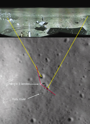 在美国航天局官网最新发布的照片上,“玉兔”号呈现为一个小小的亮点,在其附近还有另一个稍大的亮点,那是嫦娥三号着陆器。由于拍照时月球上正是日落时分,两者在月面上投下了长而清晰的阴影。此外,着陆点以东60米处就有一个直径约450米的撞击坑,深度大约是40米。