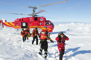 1月2日,第一批俄被困船只乘客抵达澳大利亚“南极光”号救援船附近冰面。新华社记者 张建松 摄