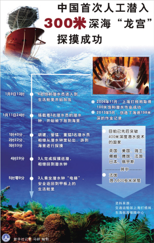 呼吸 常人呼吸的空气是由氮气和氧气组成的混合体,呼吸过程是几乎没有感觉的轻松行为。饱和潜水员的呼吸则大异于常人。300米饱和潜水潜水员带队负责人胡建说,他们呼吸的气体是由氦气和氧气组成的混合体,氦气多,氧气少,混合的比例因海深不同而不同。潜水员在生活舱和海底呼吸的都是这种气体,呼吸过程倒不困难,但声音变得像鸭子叫一样。