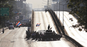 其他几支队伍也在12日这天开始搭建长期驻扎的设施,一些人用沙包等障碍物阻断交通。政府部委集中的差棱瓦塔纳路和帕吞湾路13日已无法通行。
