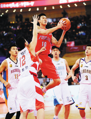 1月18日晚,2014年CBA全明星周末星锐赛,胡雪峰执教的南方星锐队以101:97战胜王治郅执教的北方星锐队。南方星锐队的朱旭航获得MVP,本场比赛他贡献25分19个篮板。图为朱旭航(中)突破上篮。新华社发