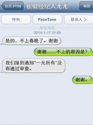 1月16日,春晚第一次联排节目单曝光后,“崔健《花房姑娘》”还赫然在列。但同一天,《纽约时报》中文网却发消息称崔健不会上春晚。对于截然相反的两个消息,记者第一时间致电和发短信联系崔健经纪人,经过差不多12个小时等待后,崔健经纪人以短信形式回复记者“不会上春晚,谢谢。”