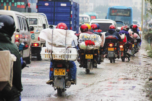 当日,粤桂交界的广西梧州市出现降雨天气,气温由20多度降至10摄氏度左右。由于春节假期已过,众多“铁骑大军”披着雨衣,穿上雨鞋,冒着寒风冷雨返回广东务工。新华社发