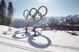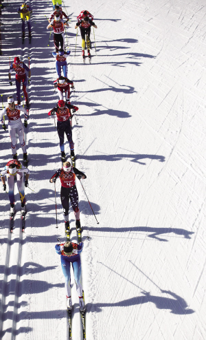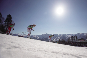 索契冬奥会期间天气晴朗,阳光灿烂,最高气温超过15摄氏度,有人戏称为“夏”奥会。图为越野滑雪运动员在充沛的阳光下竞赛的画面。新华社发