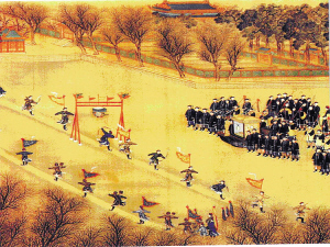 为保持八旗子弟的本色,大清帝国在入关后对“冰嬉”十分重视。溜冰既是武备又是强身的武术,所以清代每年从冬至到三九,要从各旗挑选共1600人,在冰上培训。每年腊八前后,受过训练的八旗子弟都要举行一场正式的比赛与表演,即“冰嬉大典”。这样盛大的滑冰大会,在当时绝对是举世无双的。冰嬉者由八旗将士和内务府上三旗官兵组成,他们都是一身戎装,做各种项目的精彩表演。在冰上杂技表演中,最为精彩的当属冰上射箭比赛。溜冰人身着长袍,手持弓箭,就是对这种射箭场景的写照。《清宫词》中描述道:冰莹点点放银光,箭镞闪闪似飞蝗,健儿猿臂献身手,彩球飞落报君王。