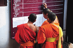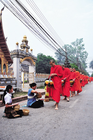 根据小乘佛教的教义,老挝每个男人一生都会出家一次,短则数天,长则终生,据说可为父辈消除原罪,为大孝。琅勃拉邦的僧侣甚至占到了总人口的近百分之一。