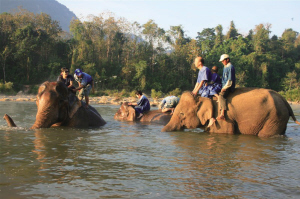 老挝又称“万象之国”,在琅勃拉邦除了悠然的生活节奏与美丽的寺庙,还有骑着大象穿越丛林,在晃晃荡荡中悠然欲睡。从城里到骑象基地,需坐船顺流而下,下了船便看到成群的亚洲象在河中泡着,双眼半闭,十分怡然。亚洲象显然比以前看的非洲象小一些,尤其是耳朵要小不少,但是这样正好,当它们扇动耳朵向我们示好时,正好是个环保电扇。