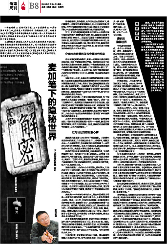 《解密》讲述的是一个新中国破译家的故事,为了国家安全义无反顾心甘情愿地“燃烧了自己”。这样一本“主旋律的书”,受到美国主流媒体毫不吝啬的追捧。《纽约时报》特派文字和摄影记者赶赴杭州,对麦家做了深度采访。该报道对麦家的评价脱离了数十年来“西方看中国作家”的传统模式,激赏麦家作品独特的“隐秘气质”,并结合当下在美国沸沸扬扬的“斯诺登”事件强调其作品的现实意义。