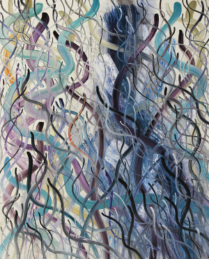 《三亚日记》是蔡蔚创作给三亚故乡的名片,它保存了一些现实的附着痕迹。而在《抽象》系列油画中,画如标题,不依附现实物件,所有的管状生物都是光滑、蠕动、柔软,像是某种纤体的动物,却找不到它们的尾巴和头,没有方向。那些生物在明亮之下没有方向倾向,画面中生物,是画家所表现的一种自由,丰足。这系列油画的疆域空间,可以想象为大海、河流、血管,甚至是暗夜,任意一幅画是其他画的延伸———因为它们运动,让它们必然要图片画框所限制。但是,它们又不紊乱,也就是不紧张,或者说它们已经疲倦了,所以才显得不紧张?无限空间、缺少方向感以及画面的“动”感,是《抽象》系列油画的最大特征。