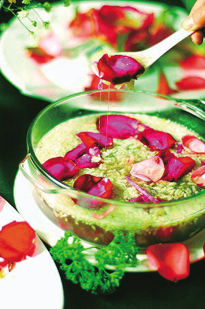 好友点的是玫瑰花樱桃豆腐,茉莉花烧湖虾,香炸荷花……那玫瑰花瓣切成的细丝洒在白白的豆腐上,真的是万白丛中一点红;那荷花原也不是真的荷花,只是像极了。面对这样的花宴,让人真的很难下筷子,个个都是艺术品。