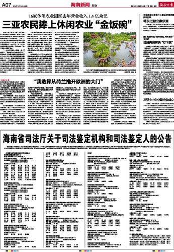 “三亚16个休闲农业园区有2个五星级示范点和3个全国示范点,发展质量较好。”三亚市农业局副局长曲环说,休闲农业将传统特色农产品与现代旅游业有效串连,形成产业带,促进农民增收,丰富三亚旅游产品,推动城乡一体化的稳步发展。