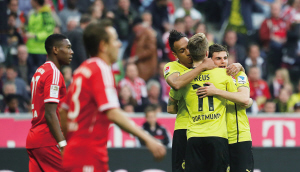 北京时间4月13日,在德甲第30轮比赛中,拜仁慕尼黑队主场以0:3不敌多特蒙德队,遭遇两连败。图为多特球员庆祝进球。 新华社发