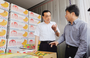 | 4月11日,在海口港秀英港区集装箱码头,李克强总理向水果商了解运销情况。 |