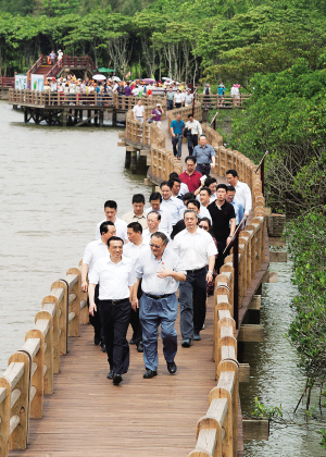 | 4月11日,在海口东寨港红树林自然保护区,李克强总理体验新修建的旅游栈道。 |