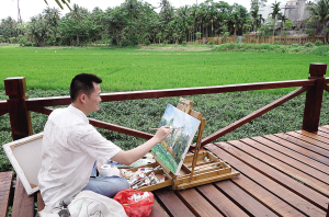 4月13日,在琼海嘉积镇的龙寿洋国家农业公园里,游客在写生田园风光。