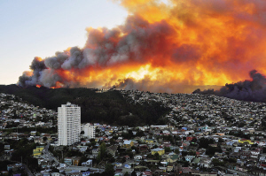4月12日,在智利瓦尔帕莱索市,发生森林火灾的区域冒出浓烟。