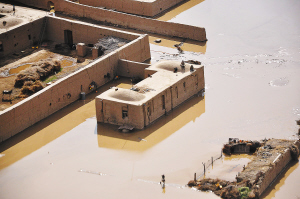这是4月25日在阿富汗北部朱兹詹省拍摄的一些被洪水包围的房屋。