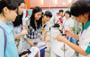 4月26日—27日,省第26届青少年科技创新大赛在海南大学思源学堂举行,大赛展出了我省青少年的200多项创新获奖作品。图为学生在交流聚光式太阳炉灶及太阳能源利用的方案。文/本报记者 范南虹 图/本报记者 苏晓杰