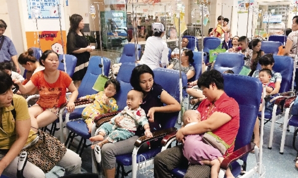 4月27日,海口市人民医院儿童输液室内挤满患儿和家长。