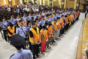 4月27日,被列为“广西一号传销大案”的组织、领导传销活动系列案在广西南宁市中级人民法院进行一审公开宣判,118名被告人犯组织、领导传销活动罪,分别被判处10年至1年7个月不等有期徒刑,并被处人民币200万元至10万元不等的罚金。 新华社发(刘君 摄)
