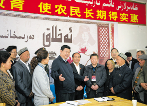 春天的新疆大地,万物复苏,生机盎然。4月27日至30日,习近平和中共中央政治局常委、全国政协主席俞正声,在中共中央政治局委员、新疆维吾尔自治区党委书记张春贤和自治区政府主席努尔·白克力陪同下,来到喀什和乌鲁木齐等地,深入乡村、企业、部队、学校、基层派出所、清真寺和新疆生产建设兵团,实地了解新疆经济社会发展情况,看望各族干部群众和部分长期在新疆工作的老同志,对做好新疆维护社会稳定、推进跨越式发展、保障和改善民生、促进民族团结、加强党的建设等工作进行指导。