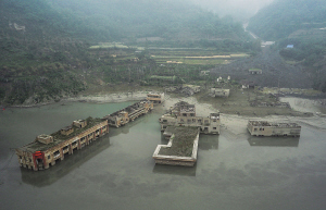 从去年7月开始,每逢唐家山堰塞湖枯水季节,被淹没的漩坪乡场镇就会露出湖面。据了解,“5·12”汶川特大地震发生当天,漩坪乡场镇损毁严重,流经场镇的河水水位不断上涨。5月12日下午3时,老场镇实施封锁,场镇居民集体撤离。随后几天,场镇被淹没。如今,露出水面的漩坪的一切生活细节几乎都被定格在那场地震中:漩坪中学教师宿舍楼、漩坪小学教学楼、漩坪乡政府办公楼、普通民宅等处在较高地势的建筑纷纷现出“真容”。新华社记者 江宏景 摄