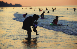 近日,随着夏日来临,我省天气越发炎热,频现高温,一些地区甚至达到37℃。在海口市假日海滩等海边,大量市民结伴前来,在玩沙戏浪中避暑。