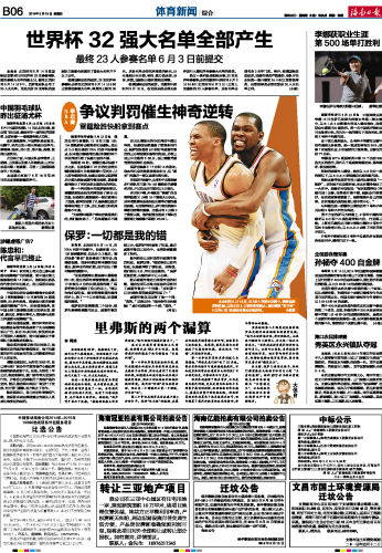 海南日报 体育新闻综合 014 2014-05-151 2014年05月15日 星期四