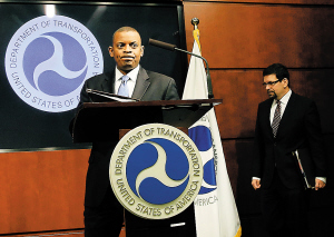 5月16日,美国运输部长安东尼·福克斯(左)出席关于通用汽车同意支付罚金的新闻发布会。