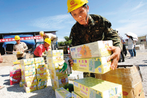 “凉茶来了,甜西瓜来了……”只见两台皮卡拖着几十箱王老吉及几箱大西瓜驶进了工地,这是昌江黎族自治县海尾镇政府为他们送来的消暑食品,有西瓜、青瓜、凉茶、矿泉水等。现场焊接工吴有秀下意识地咽了一下口水,但他口里已干得没有口水,只见露在安全帽下的发梢已完全湿透,粒粒汗珠从他黝黑的脸上不断渗出。