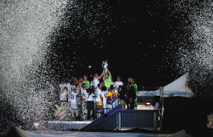北京时间5月26日,皇家马德里队在伯纳乌球场举行庆典仪式,庆祝球队收获俱乐部历史上的第10座欧冠奖杯。图为皇马队球员卡西利亚斯(中)和拉莫斯(中左)在庆典仪式上高举欧冠奖杯。 新华社发