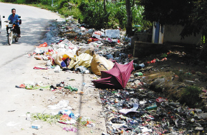 保亭黎族苗族自治县金江农场南茂分场基建一队主干道旁,各种生活垃圾散落、堆积,甚至堆上路面。