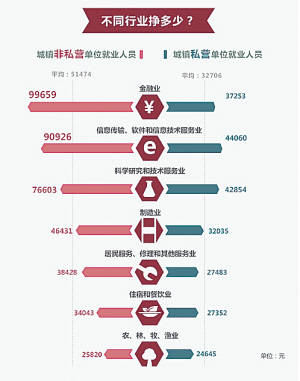 城镇私营单位年平均工资最高的三个行业分别是信息传输、软件和信息技术服务业,科学研究和技术服务业,金融业(主要是各种保险代理、典当行和投资咨询公司)。