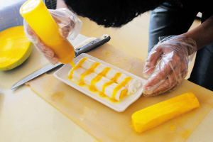 琼海的芒果肠粉是年轻人的新宠。以芒果为馅,以椰汁奶皮为面,这一道甜品有着令人欲罢不能的魔力。