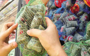 记者随后又走访了春源购物广场、大润发等超市发现,不仅粽子个头变小,今年粽子包装上也简单了许多,以散装为主,大多是用塑料网袋包装,礼盒粽子少了许多,只占了超市货架的小小一角。